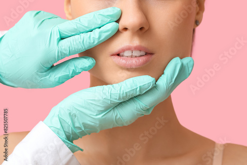 Surgeon hands touching woman nose before plastic surgery on pink background, closeup