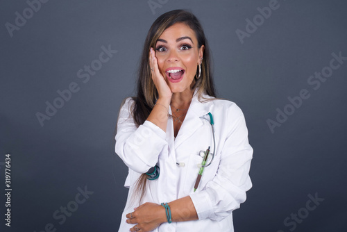 Surprise astonished beautiful doctor girl. Closeup portrait woman looking surprised in full disbelief wide open mouth with hand near face. Positive emotion facial expression body language.