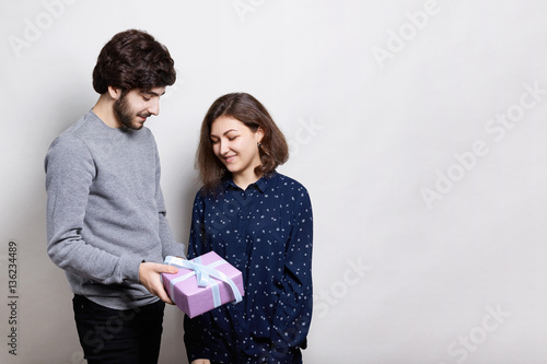 gift, love, couple, young, holiday, beautiful, celebration, present, male, romance, woman, isolated, white, man, female, attractive, people, background, hand, adult, happy, togetherness, giving, romantic, human relationships, smiling, beauty, box, smile, holding, happiness, pretty, cheerful, girl, portrait, engagement, closeness, joyful, emotion, feeling, boyfriend, girlfriend, looking, two people, white background, studio shot, eye, brunette, shirt, photogenic