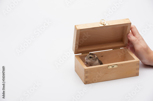 pet, hamster, cute, surprise, box, mouse, rodent, animal, fur, fluff, fluffy, funny, playful, muzzle, stock, eat, care, supply, fodder, grey, look, adorable, curious, mammal, little, small, beautiful, casket, wooden, gift, open