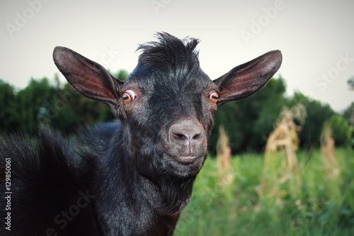 Surprised and Serious Black Goat. Funny Goggled Brown Eyes. Stare wide-eyed. Pop-Eyed.