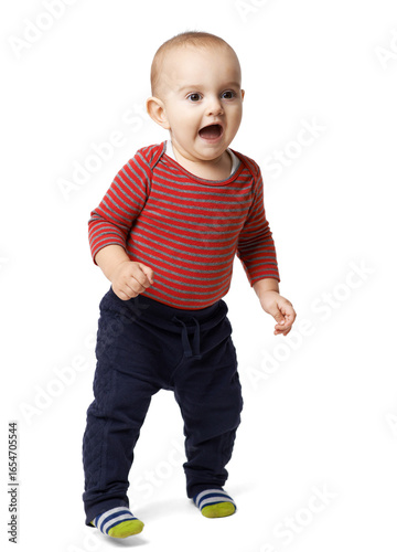 baby, surprised, cute, standing, children, toddler, expression, emotion, striped, colourful, clothes, parenting, family, childhood, adorable, innocent, happy, joyful, fun, playful, young, infant, smiling, sweet, joy, posing, vibrant, red, blue, casual attire, sock, colours, transparent, isolated, funny, play