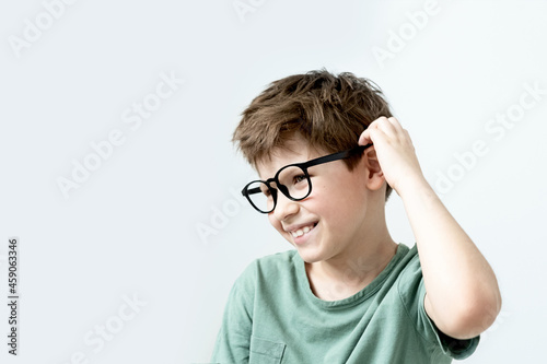 Surprised boy in a green T-shirt and glasses pensive scratches his head. Copy space.