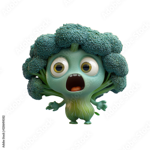 broccoli, character, three-dimensional, render, surprised, shocked, amazed, astonished, scared, frightened, fear, emotion, expression, vegetable, food, cartoon, cute, funny, whimsical, green, healthy, eating, diet, animation, mascot, icon, avatar, design element, graphic, illustration, digital artwork, artwork, creature, monster, funny face, silly, playful, vibrant, bright, isolated, studio shot