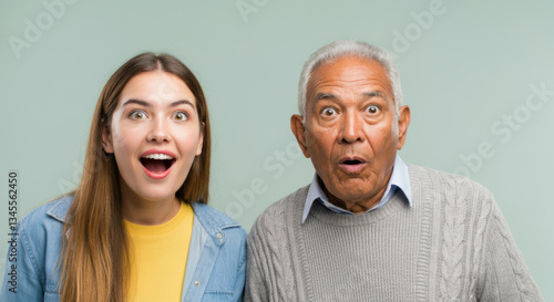surprised, female, male, caucasian, hispanic, young, elderly, expression, shock, amazement, sweater, denim, long hair, grey hair, contrasting, generation, reaction, duet, together, family, connection, diversity, emotion, excitement, facial, portrait, background, smile, curious, interaction, unexpected, wow, grey, casual attire, colours, wonder, stylish, engaging, lively