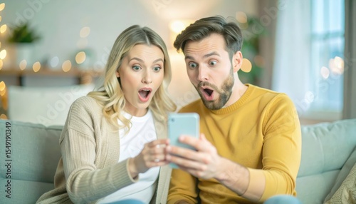 smartphone, couple, surprised, reaction, cosy, living room, excitement, joy, amazed, indoor, home, emotion, technology, casual attire, leisure, young adult, together, lifestyle, modern, friendship, happiness, entertainment, communication, engagement, festive, comfortable, expression, surprise, home decor, bright, stylish, contemporary, beautiful, light, relaxation, interaction, digital, amazement, feeling, togetherness, socialising, youth