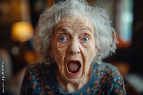 surprise, fear, elderly, woman, senior, portrait, home, emotion, expression, face, wrinkle, aged, ageing, grandmother, anxiety, shock, worry, amazed, astonished, concern, stressed, closeup, indoor, looking, eye, mouth, open, white hair, grey hair, sweater