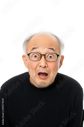 Surprised senior man expressing shock with wide eyes and open mouth isolated on white background, elderly reaction, facial expressions, emotional response.