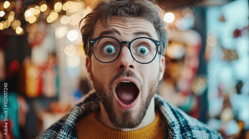surprised, shopper, excitement, market, festive, decoration, light, expression, joyful, man, goggles, beard, indoor, colourful, reaction, happiness, cheerful, portrait, amazed, winter, shopping, retail, lifestyle, emotion, fun, casual attire, clothing, vibrant