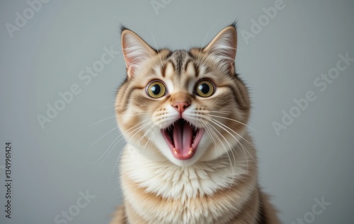 Surprised Tabby Cat with Mouth Open Close-up on Grey Background