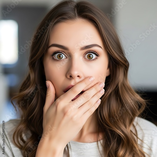 surprise, shock, woman, expression, fear, amazement, portrait, face, hand, mouth, eye, emotional, reaction, brunette, indoor, caucasian, person, female, amazement, concern, worry, anxiety, stress, disbelief, startled, scared, nervous, agitation, panic, terror, alarm, fright, horror, awe, wonder, bewilderment, confusion, perplexity, dismay, consternation, apprehension, hesitation, doubt, uncertainty, suspicion, distrust