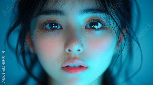 surprised, young, woman, messy, hair, blue, light, face, eye, closeup, expressive, portrait, emotion, glowing, illuminated, soft, delicate, high-coloured, captivating, gaze, mesmerizing, serene, aethereal, atmospheric, modern, isolated, intense, impressionistic, beauty, enchanting, feminine, gentle, tranquil, introspective, intrigue, wonder, sharpened, detailed, unique, striking, flow, youthful, radiant, solitary