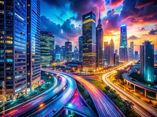 Surreal Cityscape at Night: Traffic Illuminates Urban Jungle