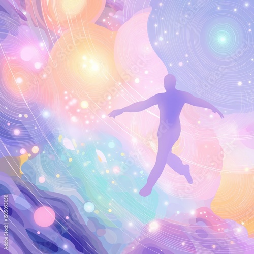 surreal, cosmic, dreamscape, silhouette, male, floating, colourful, light, abstract, fantasy, universe, aethereal, mystical, galaxy, star, vibrant, glow, dream, celestial, space, imagination, luminescent, spiritual, transcendence, harmony, balance, peace, energy, aura, motion, artistic, creative, wonder, serenity, atmospheric, illumination, cosmos, inspiration, calmness, dreamlike, journey, adventure, exploration, perspective, visual, forever, consciousness