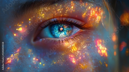 Surreal cosmic eye with glowing galaxy reflection