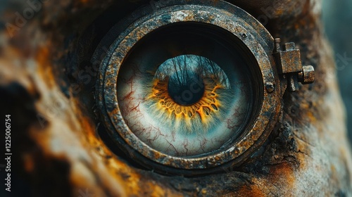 closeup, eye, monocle, rusted, skull, surreal, orange, blue, nature, texture, metal, vintage, creepy, detail, reflections, macro, vision, circular, light, dark, mystical, artistic, fantasy, photo, abstract