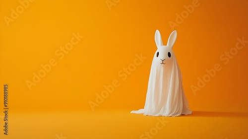 Surreal Ghostly Rabbit in Halloween Sheet on Plain Orange Background