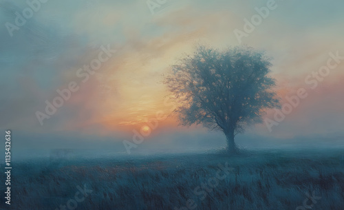 Surreal landscape at sunrise with foggy tree overlooking a misty meadow, dreamlike atmospheres