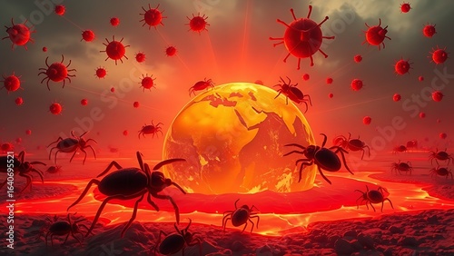 parasite, oversize, tick, crawling, threat, glowing, epidemic, vector, globe, melting, global, ominous, health, red, crisis, radiating, disease, landscape, surreal, infection