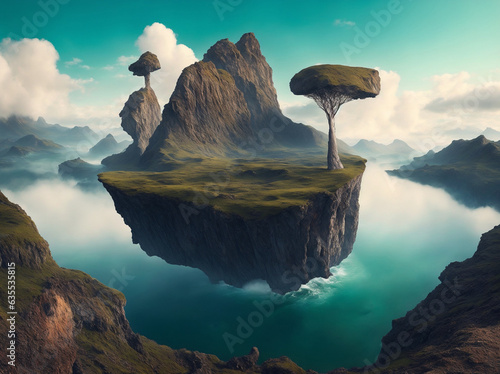 surreal landscape with floating mountain over the lake with trees and clouds
