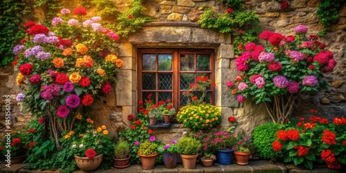 Surreal Medieval Window, Flower Decor, Fantasy Architecture, Gothic House, Floral Window Box, Dreamlike Photography, Mystical Garden, Enchanted Window