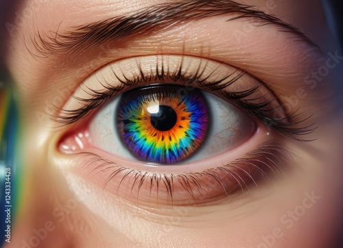 Surreal photo of eye with rainbow reflection and distorted shapes, eye, unusual