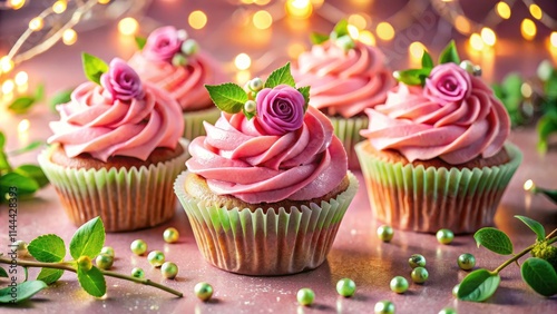 food photography, pink rose, green leaf, delicate, dreamlike, whimsical, magical, bakery, frosting, confectionery, appetising, stunning, colourful, hi-res, detailed, textured, fantasy, baking, closeup