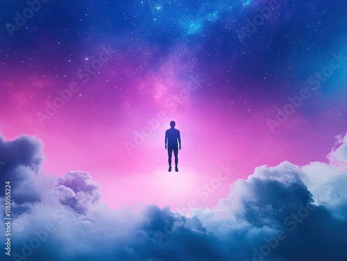 Surreal Scene of a Man Standing on a Soft Cloud Amidst a Dreamy Pink Sky Evoking a Sense of Wonder and Tranquility in a Fantasy Landscape