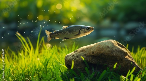 Surreal scene unfolds as a fish floats in the air above a rock amidst grass, Ai Generated.