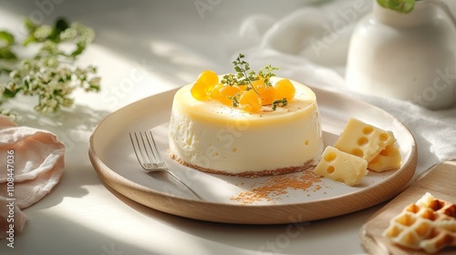 dessert, cheese, epicure, food, plate, ceramic, wooden, fork, napkin, waffle, elegant, refined, minimalistic, smooth, cream, texture, presentation, pastry, fine dining, dish, culinary, delicacy, snack, sweet, luxury, closeup, kitchen, cooking, meal, delicious, lighting, white background