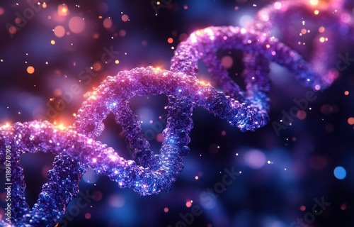 Surrealistic 3D DNA Helix Illuminated in Purple and Blue with Dreamy Bokeh Background