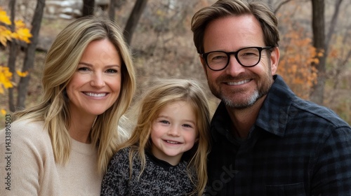 Surrounded by autumn foliage, a smiling family stands united outdoors, conveying the concept of happiness and togetherness for family-oriented content