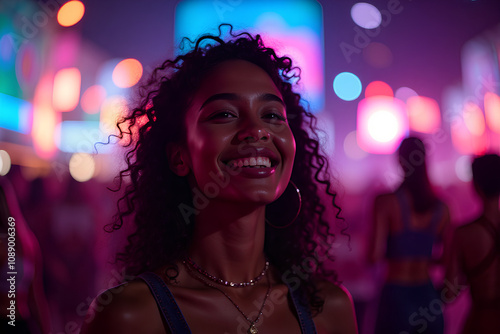Surrounded by colorful lights, a smiling black woman in casual festival wear enjoys the energy of the night, exuding confidence and happiness.