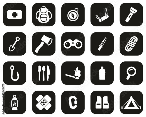survival, icon, thin, line, vector, illustration, flat, simple, outline, black, isolated, concept, web, design, silhouette, cyberspace, logotype, sticker, expedition, equipment, first aid, kit, backpack, compass, knife, torch, flashlight, shovel, axe, binocular, rope, climbing, fork, spoon, match, fire, bottle, water, magnifying glass, bandage, tent, medicals, utility, rescue, situation, symbol