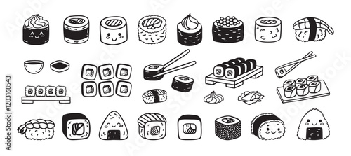 Sushi funny doodle set. Japanese hand drawn Food Sketch Icons. Kawaii drawing