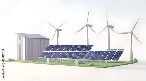 Sustainable energy station with solar panels, wind turbines, and a small building on a clear day.