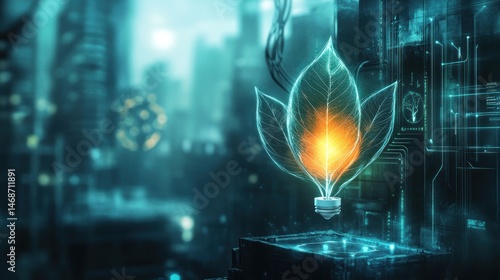 sustainable, future, technology, innovation, energy, environment, eco, green, light bulb, leaf, city, urban, digital, design, concept, illustration, graphic, glowing, bright, tech, circuit, renewable, clean, efficient, environmentally friendly, smart, modern, building, solution, growth, progress, nature, light, power