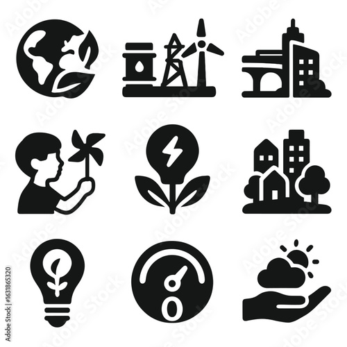 sustainable, future, icon, solid, style, vision, renewable, planet, icon, energy, evolution, timeline, ready, infrastructure, children, with, windmill, toy, eco, innovation, symbol, city landscape, green, tech, light bulb, zero, carbon