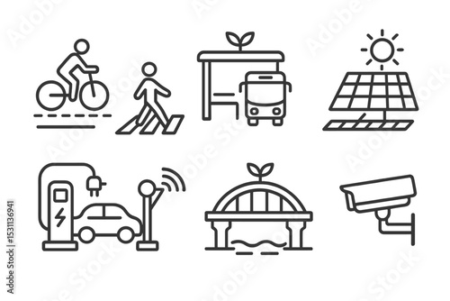 sustainable, infrastructure, icon, line, style, bike, lane, pedestrian, crossing, green, bus, stop, solar, road, charging, hub, smart, street light, bridge, traffic, camera, text, label, isolated, transparent, background