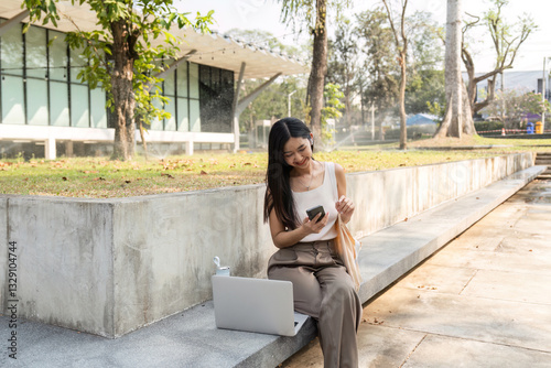 sustainable, lifestyle, outdoors, woman, smiling, smartphone, happy, urban, nature, technology, casual attire, positive, creative, freelancer, relaxed, environment, daytime, wellness, connection, content, young adult, inspiration, green, social, energetic, charming, professional, sunlight, joyful