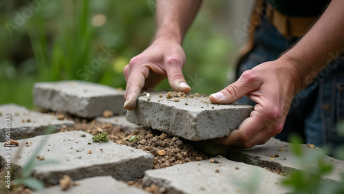 man, hand, landscaping, precision, craftsmanship, garden, yard, construction, foundation, hard-wearing, hand tool, levelling, safety, stone wall, environment, aesthetic, design, landscape architecture, fence, maintenance, rustic, rural, stone carving