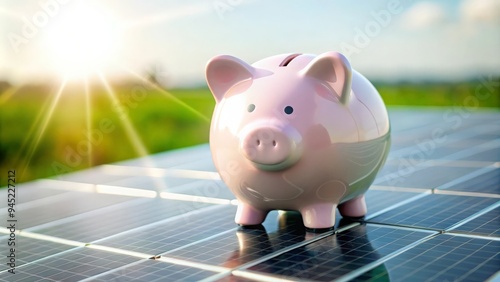 Sustainable Money Saving - Piggy bank on solar panels, with a blurred natural environment.