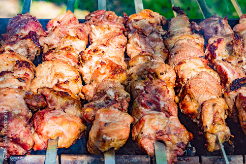 Sven shashlik closeup mashed slices of meat put on metal skewers roasted on charcoal grill with charcoal on otlichie