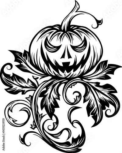 SVG artwork blending botanical horror with skulls and eerie flowers. Spooky Pumpkin Design with Intricate Swirls and Leaves Decoration