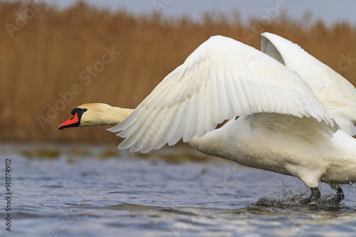 swan flies on blue lake water in sunny day