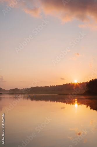 Swans on a misty lake at sunrise. Lynford Lakes, Norfolk, UK.