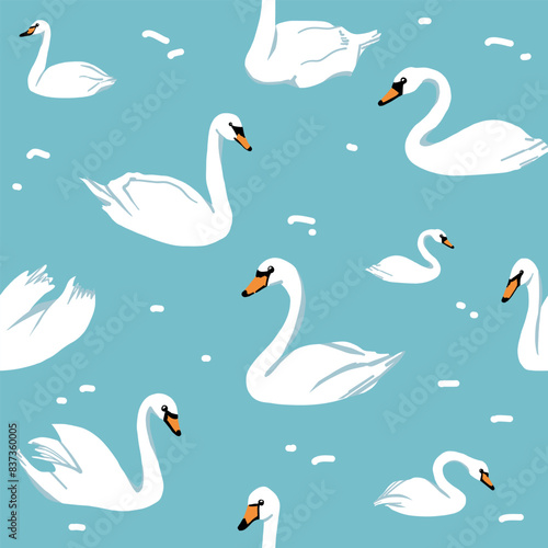 Swans Seamless Pattern on Blue Water Lake Background. Vector Illustration