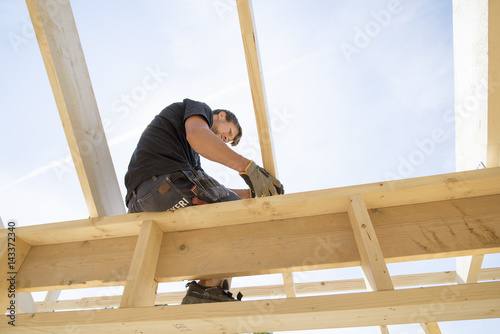 Sweden, Sodermanland, Low angle view of carpenter sitting on wooden bar on construction site
