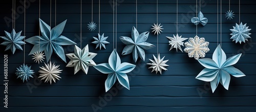Swedish-style winter decorations made from origami paper craft snowflakes.
