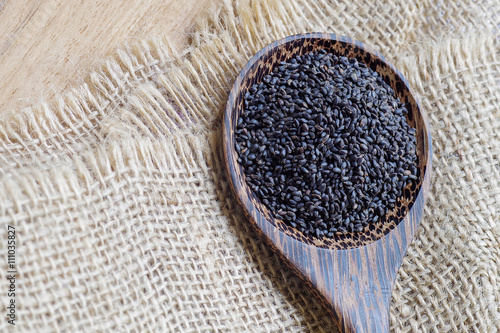 Sweet basil seeds in wooden spoon on burlap and wood background
